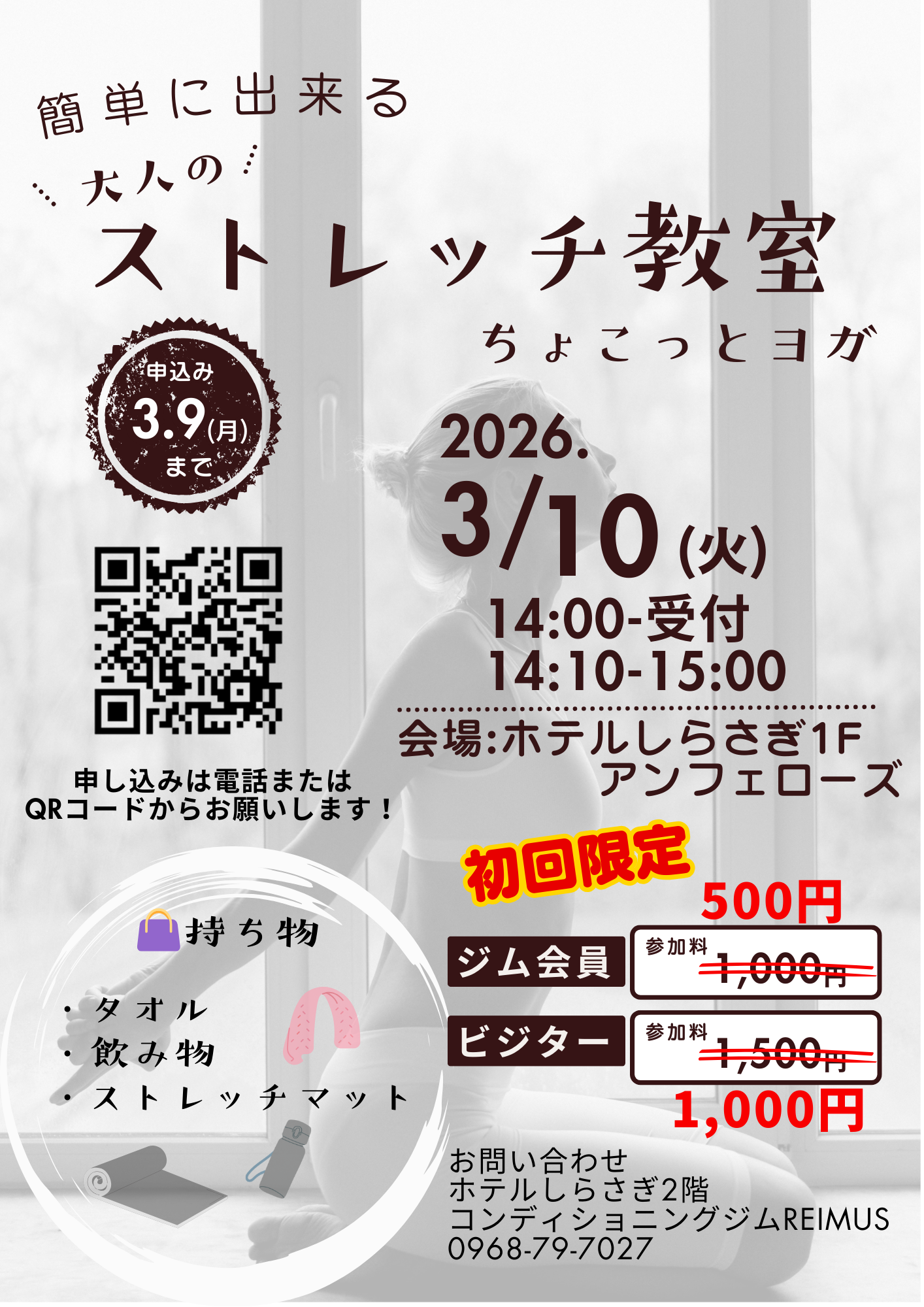 2026年3月10日(火)14:00~15:00に、大人のストレッチ教室~ちょこっとヨガ~を開催いたします。