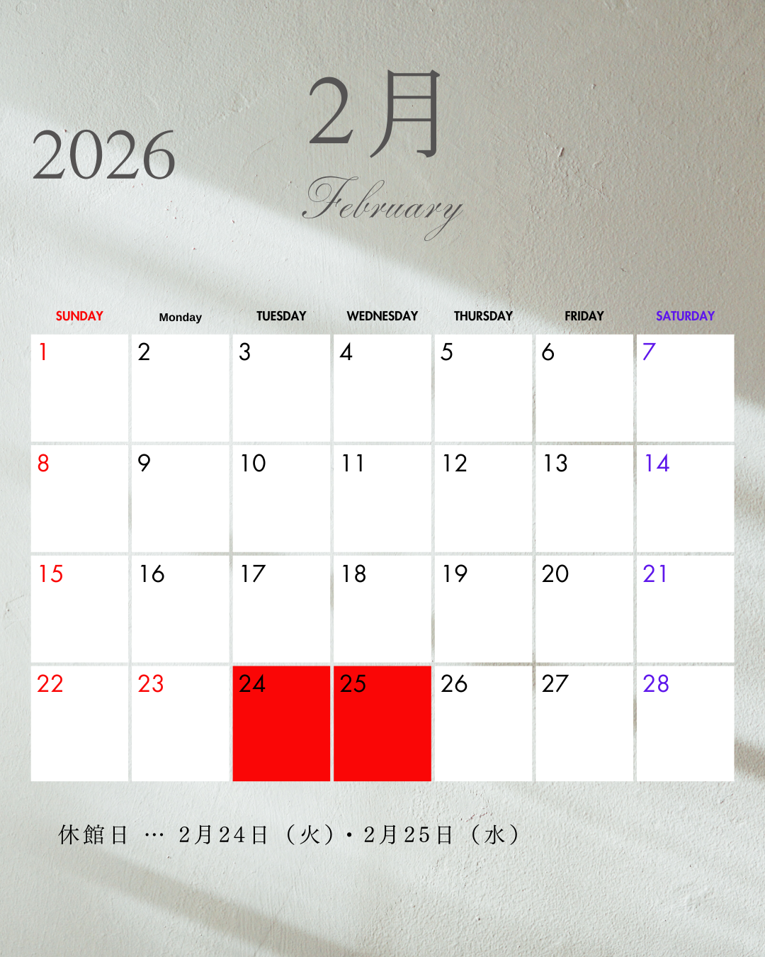 2026.02.05 2月の休館日について📅 Uncategorized 2/24(火)・2/25(水) 上記期間は、ホテル休館日のためジムも休館となります。ご迷惑をおかけしますが、何卒宜しくお願い致します。 執筆者:reimus TOPページ Uncategorized 関連記事 2022.04.02 新年度🔥 2022.02.26 痛みについての雑学 2022.07.06 七夕🎋 2021.12.04 クリスマスツリーを頂きました🎄 2022.08.29 9月の休館日について 2021.12.14 入口ドア完成✨
