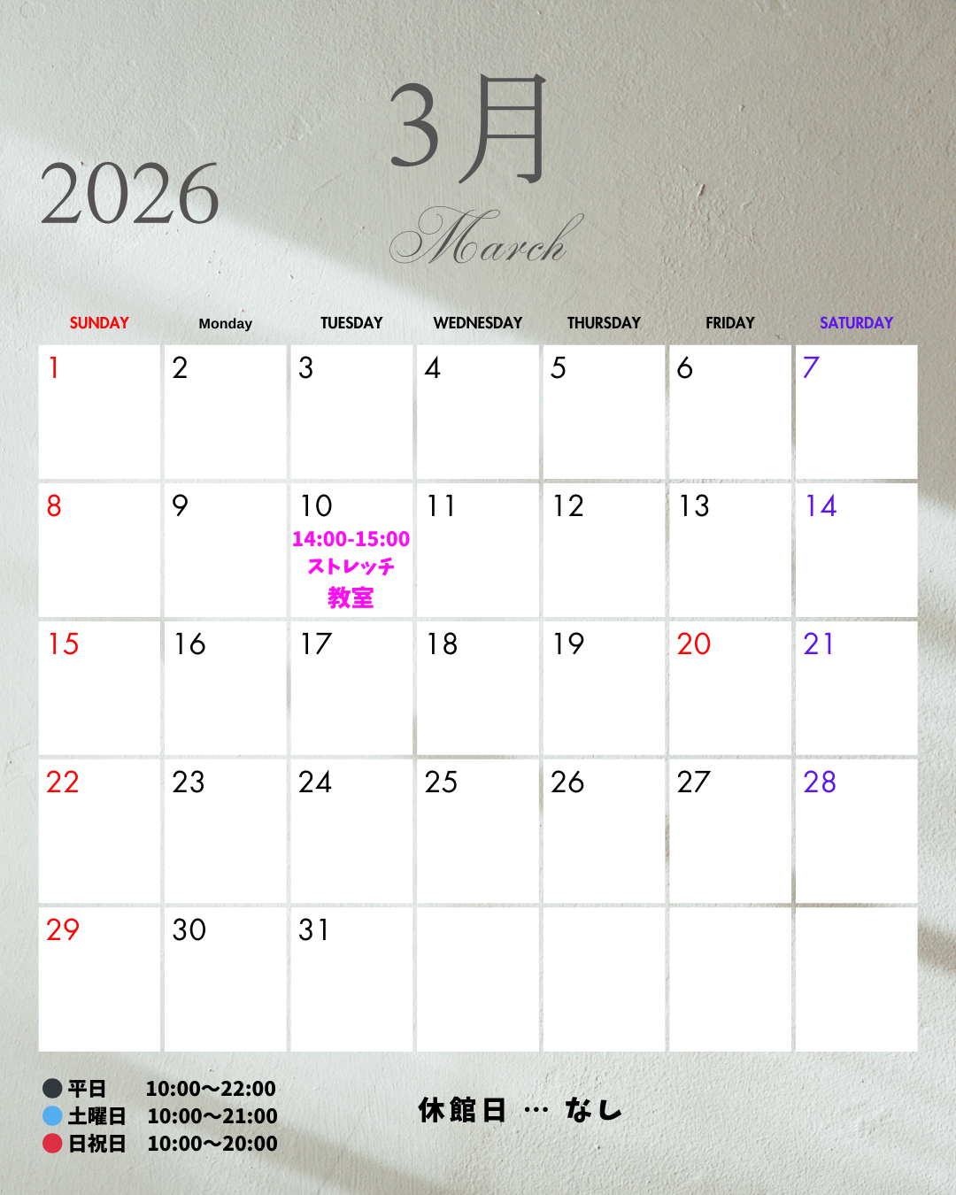 2026.03.03 3月の休館日について📅 Uncategorized 3月は休館日の予定はございません。通常どおり開館いたしますので、ぜひご利用ください! 執筆者:reimus TOPページ Uncategorized 関連記事 2023.01.03 新年明けましておめでとうございます🌄 2022.08.01 ようこそ8月🌞 2022.02.12 矢状面の安定化と重要性 2026.01.07 LINE友達追加された方限定‼ 12月のクーポン配布中🎁 2021.12.18 お気を付けください💦 2021.11.30 ガラス取り付け完了!